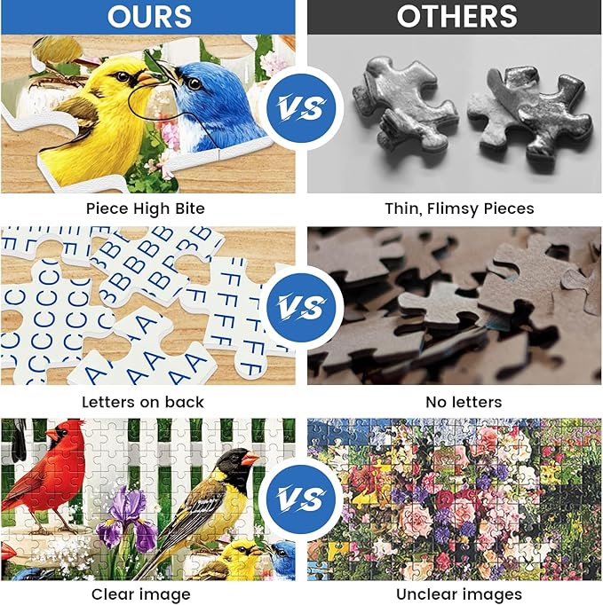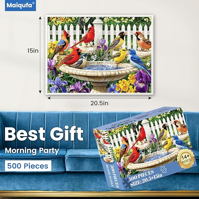 - 500-PIECE COLORFUL BIRDS - Immerse yourself in a picturesque summer scene, where vibrant birds gather around a graceful birdbath nestled amidst blossoming flowers and lush greenery. Experience the joy of putting together this captivating puzzle set.