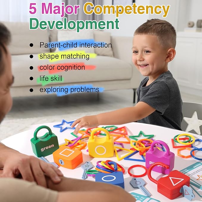 - Novel lock and key toys: Introduce your child to the world of color, shape and geometry with a lock and key preschool game. This pre-school Montessori toy has 6 locks, 6 keys, 36 geometric rings and 60 cards, making it a perfect operating tool for school and home, it helps children practice fine motor skills and hand-eye coordination.