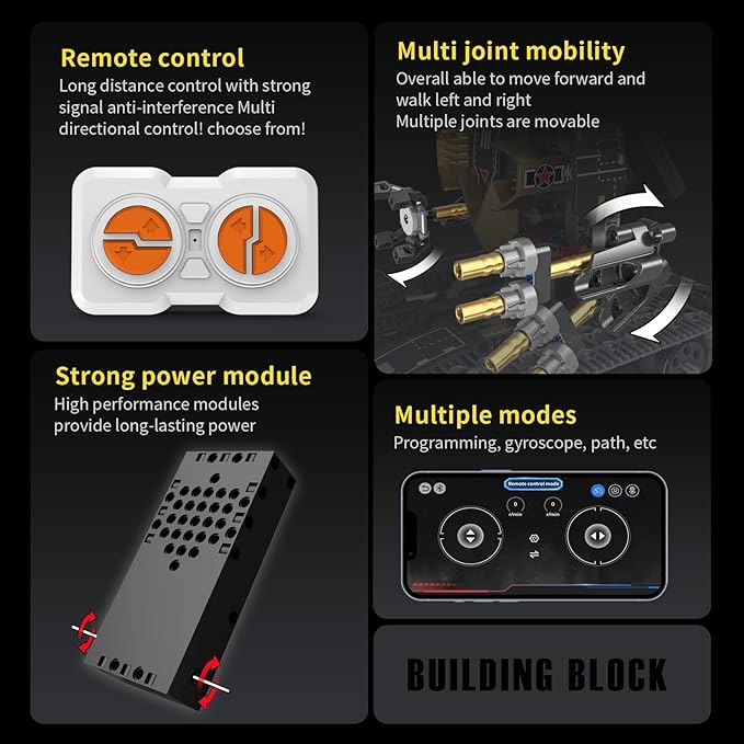 - 【New motor module RC function】Remote distance within 30 meters, forward, backward, left and right. Modeling with lighting, more realistic and vivid. 2.4G remote control supports 2 or more players to play together, fight is on!