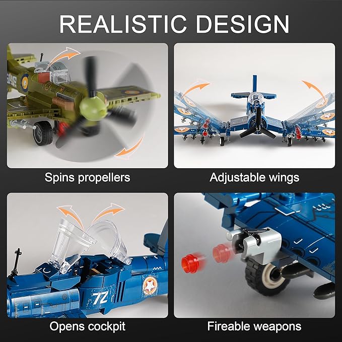 - Two WW2 Military Plane Models: The American F4U fighter jet and UK spitfire fighter plane toy allows kids to bring their imagination into the historical WW2 aerial combat scenarios. opens cockpit door, spins propellers , glides wheels, the wings of the F4U fighter airplane can be folded up or down, adding to the excitement of playtime