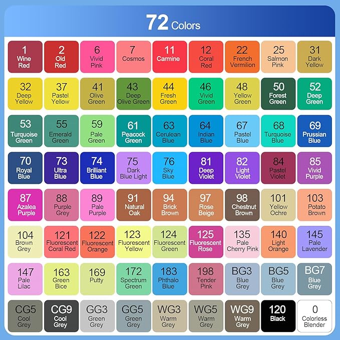 - 【72 VIBRANT COLORS】72 colors unique art marker pens bring your art to life, multiple choices, standard colors on the pen, new color system, no deviation, natural transition, natural color overlap, outstanding effect, bright color, easy to blend. Whether it's a coloring book or a masterpiece in the making, your artwork is sure to shine with these brush markers. Great as art markers, sketch markers, permanent markers, alcohol based markers, paint markers.