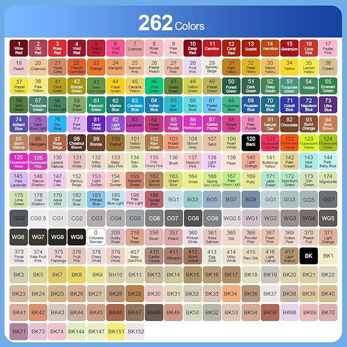 - 【262 VIBRANT COLORS】262 colors unique art marker pens bring your art to life, multiple choices, standard colors on the pen, new color system, no deviation, natural transition, natural color overlap, outstanding effect, bright color, easy to blend. Whether it's a coloring book or a masterpiece in the making, your artwork is sure to shine with these brush markers. Great as art markers, sketch markers, permanent markers, alcohol based markers, paint markers.