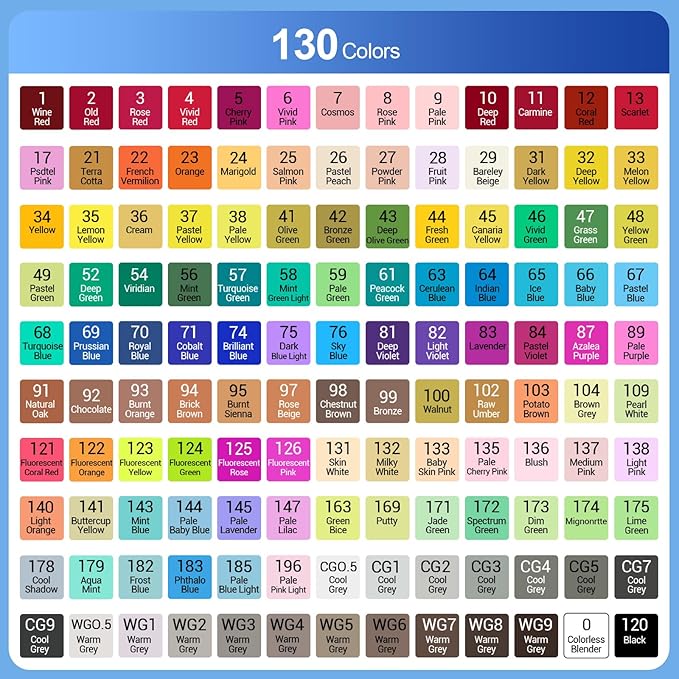 - 【130 VIBRANT COLORS】130 colors unique art marker pens bring your art to life, multiple choices, standard colors on the pen, new color system, no deviation, natural transition, natural color overlap, outstanding effect, bright color, easy to blend. Whether it's a coloring book or a masterpiece in the making, your artwork is sure to shine with these brush markers. Great as art markers, sketch markers, permanent markers, alcohol based markers, paint markers.