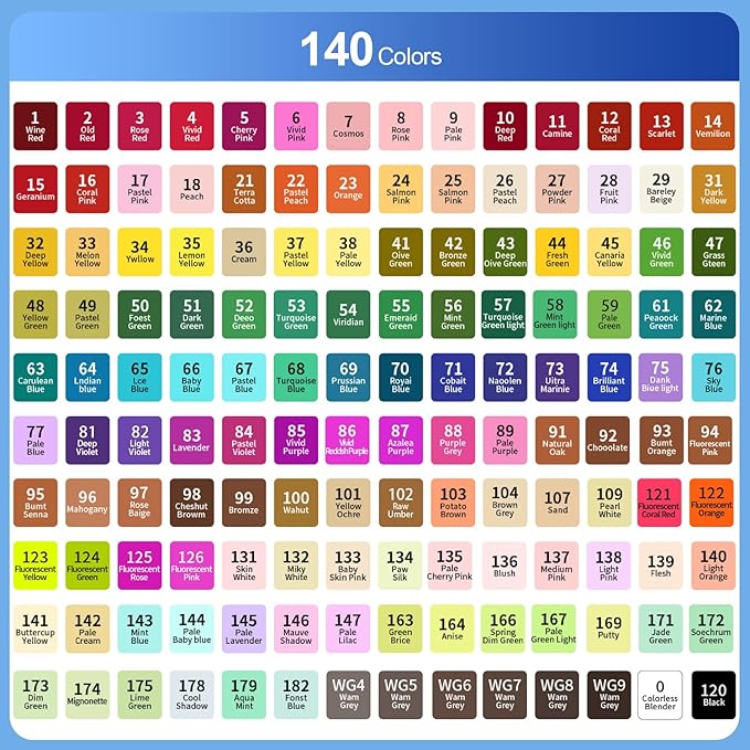 - 【140 VIBRANT COLORS】140 colors unique art marker pens bring your art to life, multiple choices, standard colors on the pen, new color system, no deviation, natural transition, natural color overlap, outstanding effect, bright color, easy to blend. Whether it's a coloring book or a masterpiece in the making, your artwork is sure to shine with these brush markers. Great as art markers, sketch markers, permanent markers, alcohol based markers, paint markers.
