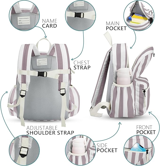 - Safety Reflective Strip and Handy D-rings: Equipped with a hidden reflective strip along the front pocket zipper, our backpacks enhance nighttime visibility. Additionally, two front D-rings offer the convenience of attaching items like a child's leash or pencil case.