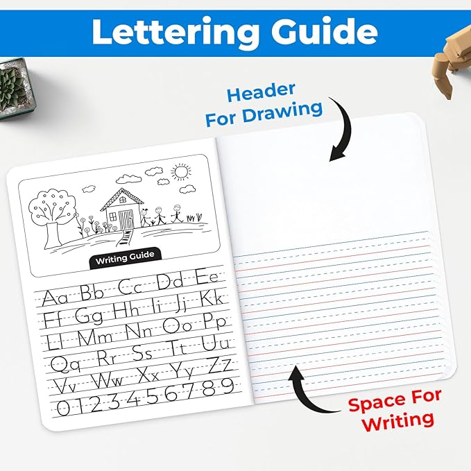 - KID-FRIENDLY, DOTTED MIDLINE: Each writing line features a dotted midline, which helps young writers learn to form lowercase and uppercase letters correctly. This structured format guides proper letter sizing and alignment, supporting handwriting development.