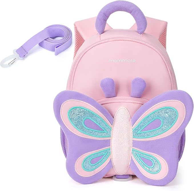 mommore Toddler Backpack for Girls 2-4 Cute 3D Kids Backpack Butterfly Small Pre-K Backpacks Water-Resistant for Preschool Kindergarten with Toddler Leash, Chest Buckle