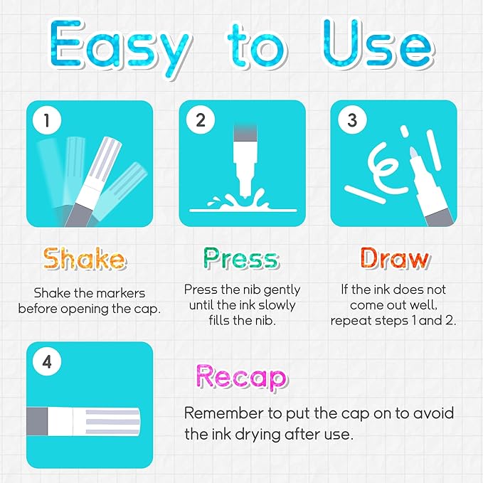 - Safety First: Our glitter paint pens are non-toxic. The glitter pens set meets ASTM d-4236 and EN-71 safety standards, and is suitable for artists of all ages