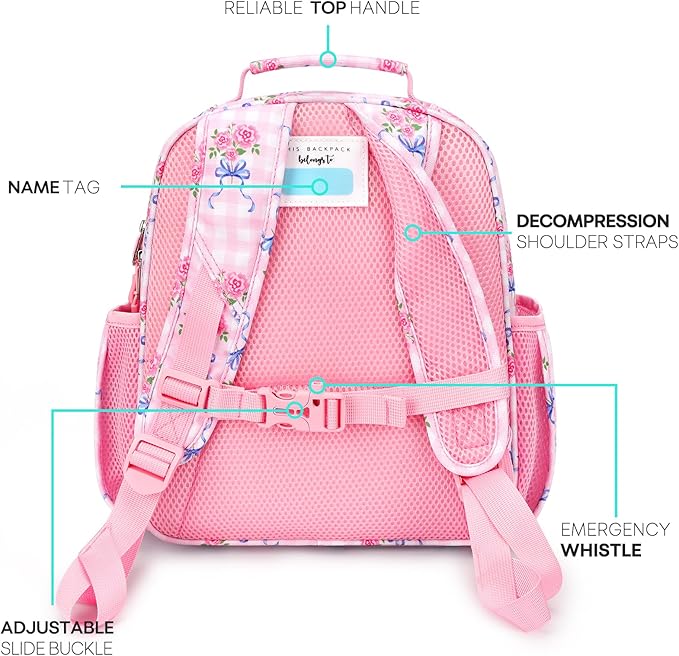 - Surprise design: The toddler girl backpack includes a name tag for personalization, a breathable back panel to prevent sweating, and adjustable shoulder straps to fit a variety of body sizes. The unique whistle design on the chest buckle serves as both a toy and an emergency alarm.
