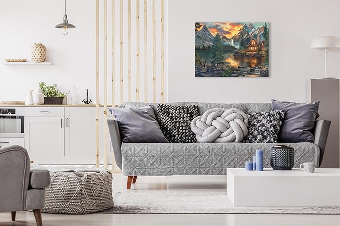 - COMPELLING AND FRAME WORTHY ARTWORK - A cozy cabin sits by a peaceful lake nestled in the mountains, glowing in the warm hues of sunset. The sky is ablaze with oranges and pinks, reflecting off the calm waters where ducks gently float. A loyal dog stands at the water’s edge, watching the ducks with quiet curiosity.