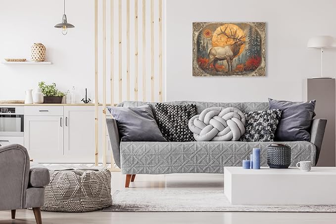 - COMPELLING AND FRAME WORTHY ARTWORK - A majestic 7-point bull elk stands proudly in a vibrant fall forest, its impressive antlers reaching high above the autumn leaves. A striking Native American border surrounds the scene, adorned with intricate patterns and earthy tones.
