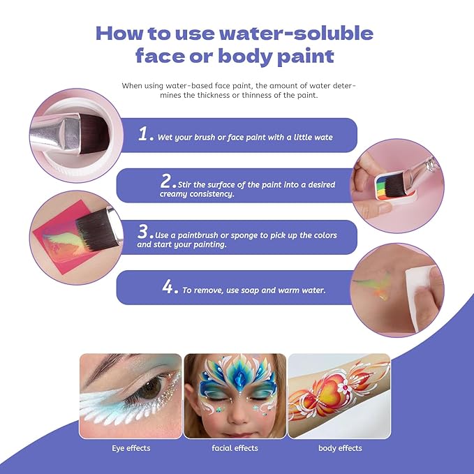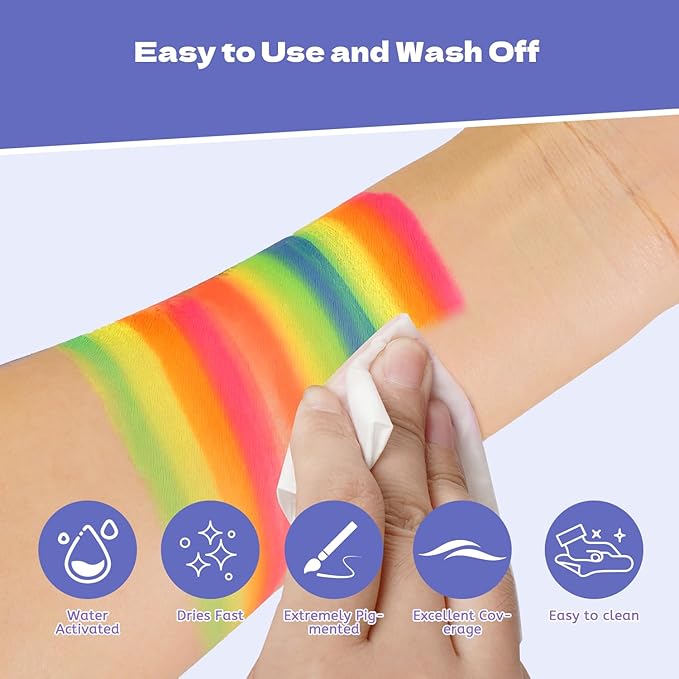 - Easy to Use and Wash Off face painting kit professional: Different from cleaning oil-based painting;Our Face Painting kits Water Activated and Dries Fast With Extremely Pigmented,Provide Long Lasting,Smooth and Excellent Coverage,Less Prone to Fading or Cracking.Please note that it is not waterproof,Easy to clean ,You Can Easy Wash Off With Soap and Water or Wet Wipes
