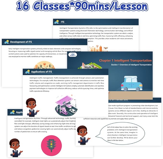 - 【Multi-function Smart Kit】: Through the first level of the Smart Transportation Education Kit, students can understand the concepts and applications of smart transportation. They will learn the basics of the ESP32 development board, programming basics, basic electronic circuits, and the use of electronic modules. Students can also build practical projects such as smart street lights, smart traffic lights, smart intersections, and smart parking lots.
