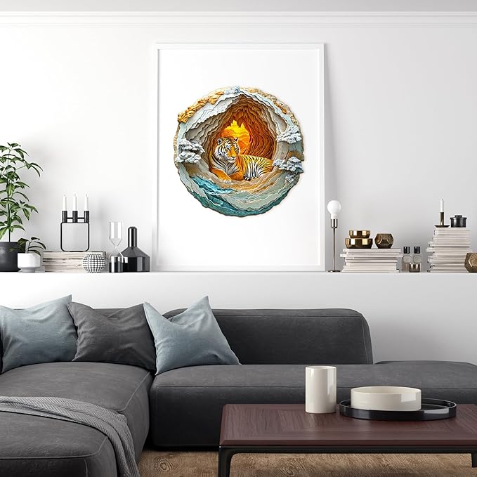 - [Wooden Puzzles for Adults-Tiger Puzzle] - This wooden jigsaw puzzle shows in three dimensions an unruffled tiger lying on its back at the entrance of a cave with a beautiful view of the sun setting outside the cave! The wooden jigsaw puzzle consists of 300 unique irregular shapes, high difficulty wooden puzzles are very challenging and make puzzle time more fun and enjoyable. Our store puzzles are available in 3-4 sizes to meet the needs of puzzle enthusiasts of all levels.