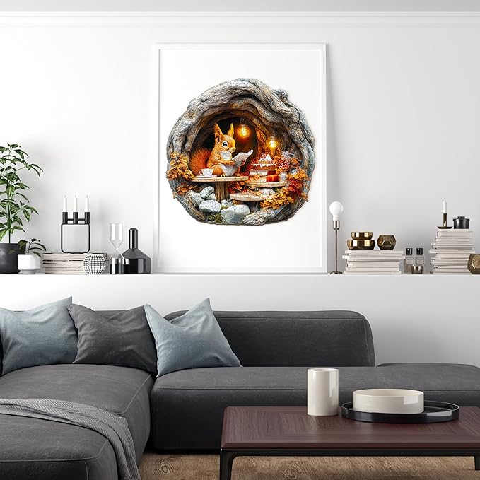 - [Wooden Puzzles for Adults] - This wooden jigsaw puzzle shows in three dimensions a cute little squirrel reading seriously in his burrow with a lamp lit and a cup of coffee and a delicious cake on the table, such a scene looks very harmonious! The wooden jigsaw puzzle consists of 300 unique irregular shapes, high difficulty wooden puzzles are very challenging and make puzzle time more fun and enjoyable. Our store puzzles are available in 3-4 sizes to meet the needs of puzzle enthusiasts of all levels.