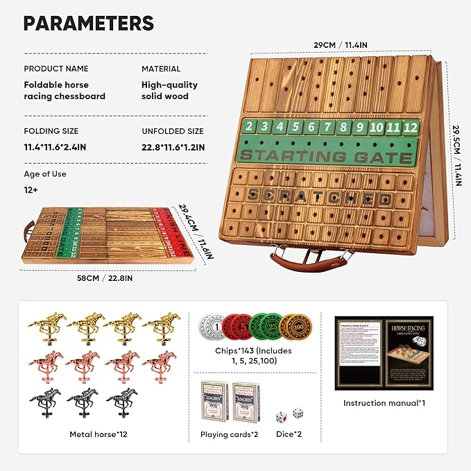 - Complete Accessories: Chessboard, 11 metal horses, 143 chips, 2 decks of playing cards, 2 dice, and storage bags. We have prepared all the entertainment accessories you can think of, allowing you to enjoy the fun of the game to the fullest! There is also a clear rule manual, even for friends who are new to it, they can easily get started and quickly activate the Happy Game mode.