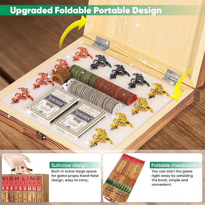 Large 22.8 inches Foldable Horse Race Board Game for Adults, Thickened Solid Wood with 11 Luxurious Durable Classic Metal Horses, 143 Chips, 2 Dice, 2 Boxes of Cards