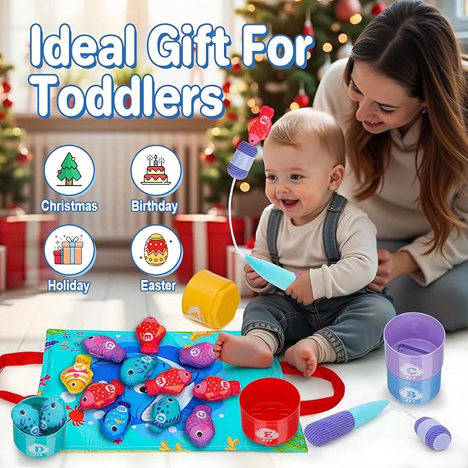 - Montessori Fishing Game Set: This 23 pcs cloth fishing kit includes 2 rods, 15 colorful fish, 5 stackable buckets, and an ocean-themed mat (also serves as convenient storage). Perfect Montessori toys for 1-3 year olds to stimulate curiosity and support sensory development. Keep your toddlers entertained and learning with these fun and engaging baby toys!