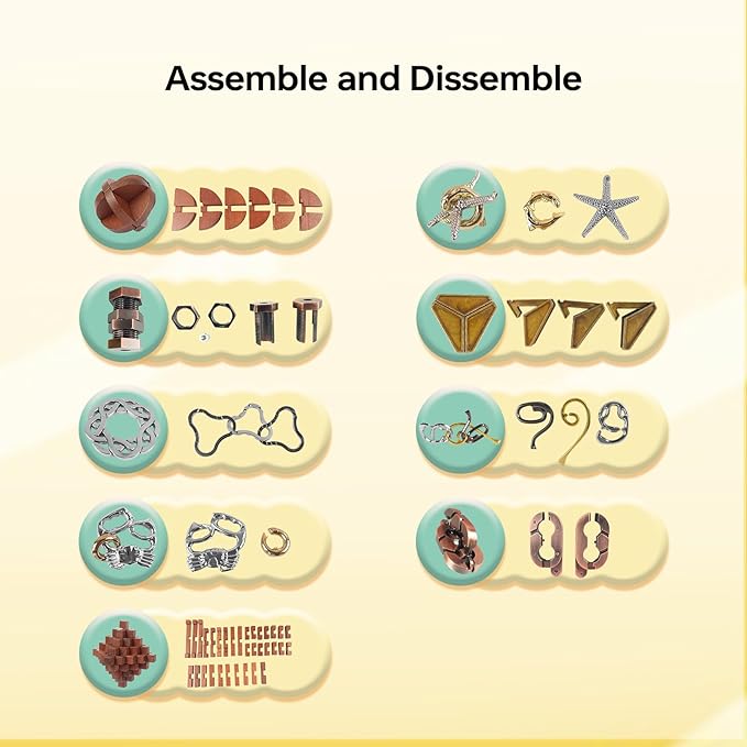 - [BRAIN TEASER PUZZLES ADULTS, TEENS, AND KIDS] Zinc alloy 3D metal puzzles and wooden puzzles are smooth for brain game, puzzles set do not easily bend or break even when thrown or stepped on. Assembly puzzles and disentanglement puzzles are a healthier way to passing time, practice focus and concentration, get them as an IQ test challenge game in limited time, bring lots of Logical fun.