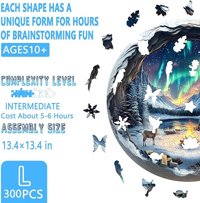 Wooden Puzzles for Adults, Flat Puzzle with 3D Visual Effect, Aurora World Wooden Jigsaw Puzzles for Adults 300 Pieces, Winter Wood Puzzles Adult, Unique Shape, Wall Art Canvas Puzzle (L-13.4*13.4in)