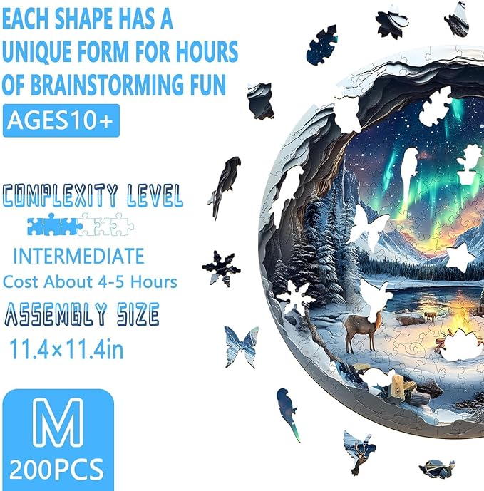 Wooden Puzzles for Adults, Flat Puzzle with 3D Visual Effect, Aurora World Wooden Jigsaw Puzzles for Adults 200 Pieces, Winter Wood Puzzles Adult, Unique Shape, Wall Art Canvas Puzzle (M-11.4*11.4in)