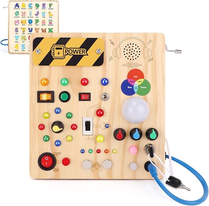 - Elaborate Design - This busy board is made especially for young children who like playing with switches and LED lights. On this busy board, there are 13 separate switches, and each switch relates to a different color or style of LED light. Each LED's brightness is set to be just right for the infant-not too bright, blinding, or dark to see well. It includes a music box, human body conductivity, and color mixing recognition, providing an exceptional play and learning experience.