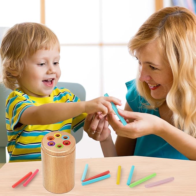 - Play in Learning - Toddlers love putting objects into slots and holes, and our color sorting toy is designed to captivate this natural curiosity. It includes 12 colorful sticks in 6 vibrant colors and a sturdy wooden container. Toddlers can match the colorful sticks to the corresponding holes, providing an engaging and educational experience. This hands-on activity not only offers fun but also helps improve hand-eye coordination and teaches key concepts like color sorting and numbers.