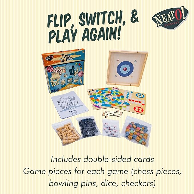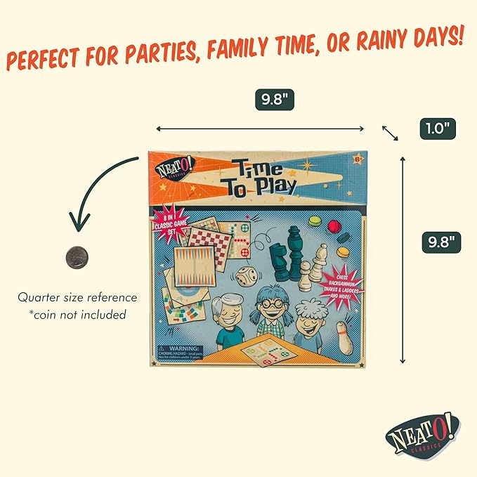Neato Time to Play 8-in-1 Wooden Board Game Set – Chess, Checkers, Backgammon, Bowling, Sling Puck, Snakes and Ladders, Racing – Classic Family Game for Kids & Adults – Great for Game Night & Travel