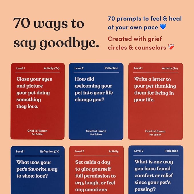 - NAVIGATE YOUR LOSS: Guide yourself through the grieving process of losing a beloved pet with a thoughtfully designed card game that provides support and healing. This game helps you process your grief, offering comfort and reflection during a difficult time.