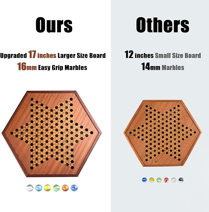 - Upgraded 17 inches Version: This beautiful wooden Chinese Checkers board is made from high quality wood, upgraded larger size board, measures 17''L by 15"W by 1.7"T. Larger balls: 16mm=0.06 inch for more easy grasp and place for all age groups