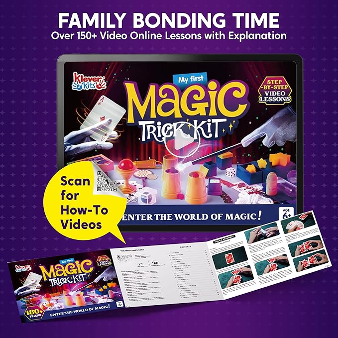 Klever Kits 180+ Magic Set- My First Magic Trick Kit- Amazing Magician Toy with Step-by-Step Video Lessons, for Kids Aged 6+ Easy Tricks of Wand and Illusion Cards