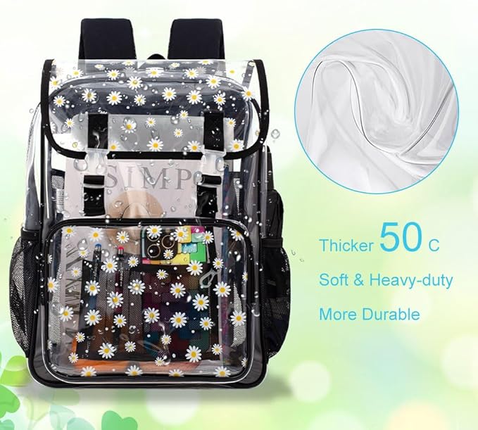 - Fashion Clear Backpack for Girls: Unique flap style, dotted with lots of cute small daisy, bright and attractive, make you more different, can be a great gift for back to school or birthday.
