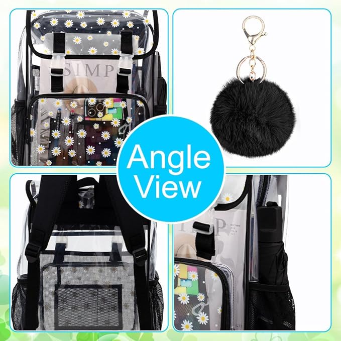 - Clear Backpack 4-in-1: Clear backpack (17*12*6.5Inche) with lunch box(11*8.5*6.5Inche) and pencil bag, also a free furry pom, classic matching design, to meet your daily travel needs.