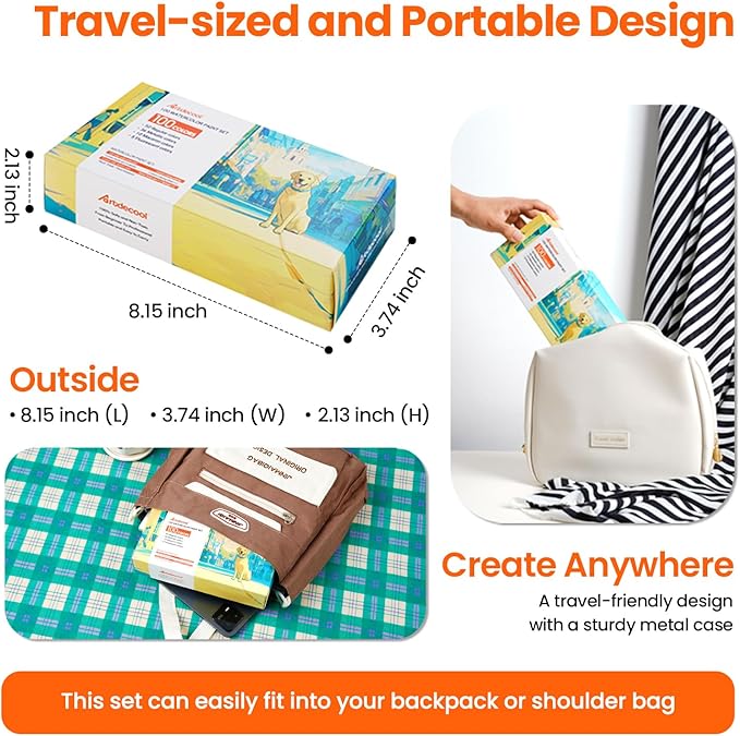- | Travel-sized & Portable Design | - Artdecool Watercolor Paint Kit features a travel-friendly design with a sturdy metal case, measuring 8 x 4 x 2 inches and weighing only 14 ounces, easily fitting into your backpack or shoulder bag. Its compact size allows for creativity in traditional art, indoor painting, outdoor sketching, family activities, travel painting, and community events. Ideal locations include parks, museums, gardens, and balconies. Wherever you are, you can create art anytime, anywhere
