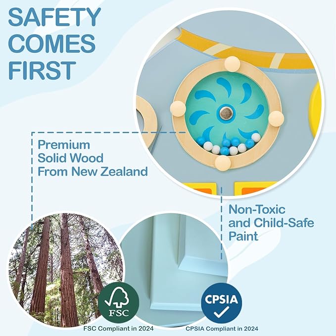- SAFETY FIRST: Crafted with the highest quality solid wood from New Zealand, our busy board has passed rigorous safety tests and received the Children's Product Certificate from a CPSC accredited laboratory, ensuring a safe play environment for little ones.