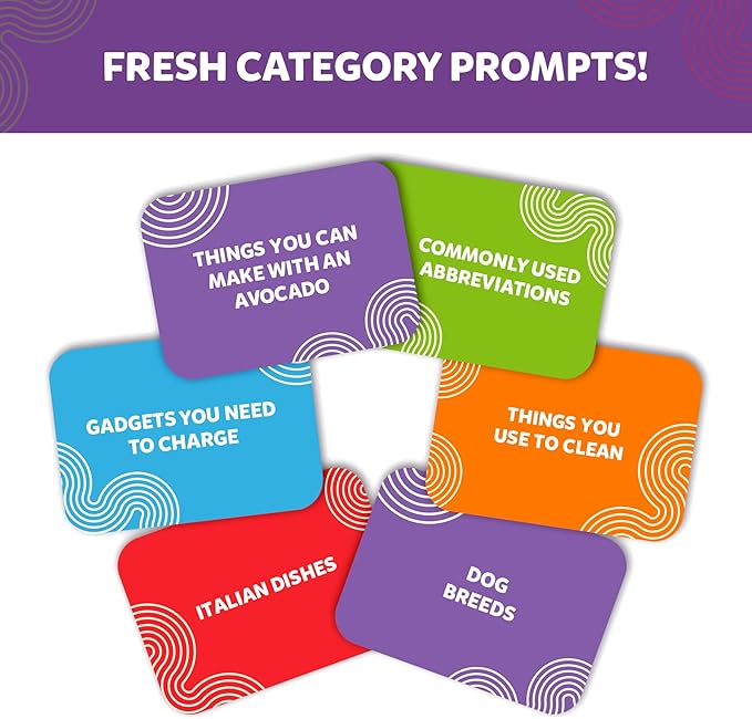 - HOW TO PLAY: Flip over 4 letter cards, a wild card, and a category card. Players must quickly write 5 unique words that fit the category. Each word can start with any of the letter cards (repeats are allowed), or you can use the wild card to make all your words start with the same letter—except the revealed letters. The first player to finish yells "STOP!" and everyone stops writing. Players then compare words—only unique words score points, and points are based on their starting letters. The player with the most points wins!