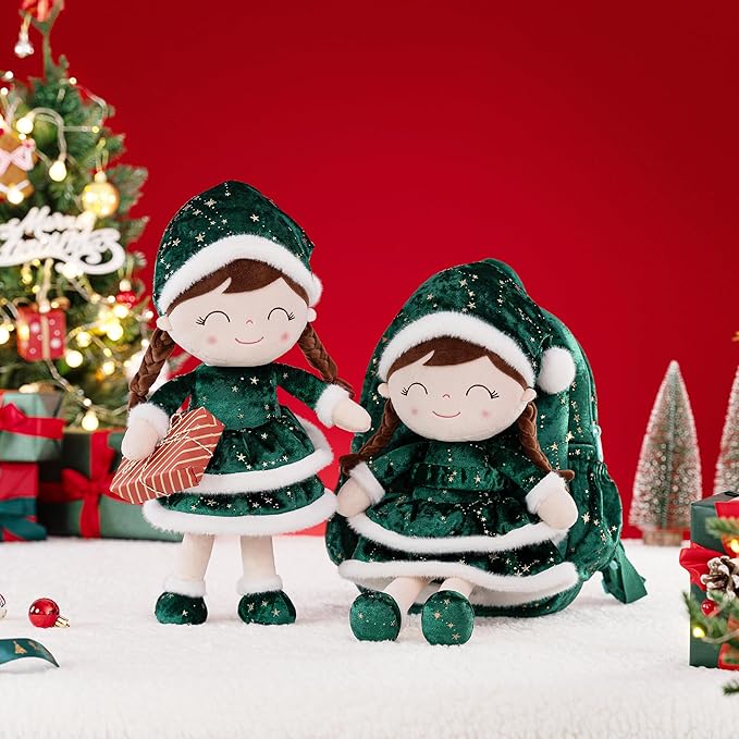 - 🎄Luxurious Christmas Green Design with Festive Charm This Christmas doll backpack features an elegant Christmas green fabric with gold stars, creating a magical holiday atmosphere. The high-end materials and fine craftsmanship make it a special gift for any little one, perfect for Christmas, birthdays, or any occasion that calls for a festive surprise.
