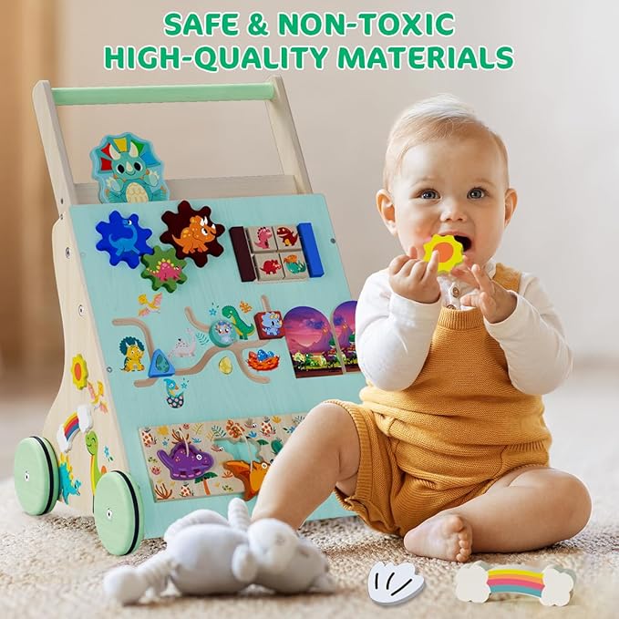 - Multifunctional Baby Walker: This fun wooden walker has a unique dinosaur appearance, which can be pushed and pulled and learn various skills. It has fascinating elements such as dinosaur sliders, rotating gears, matching flaps, fun mazes, Jurassic gates, etc. It provides a comprehensive and interesting experience, stimulating baby's curiosity and interest in dinosaurs
