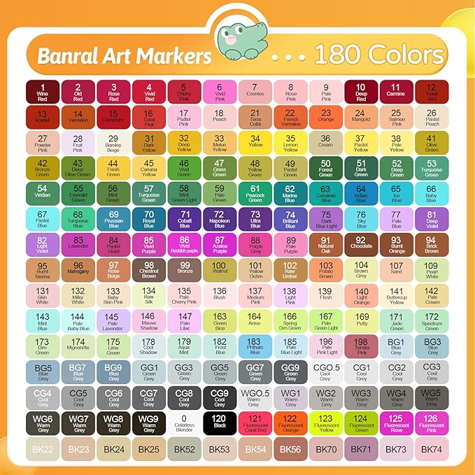 - 【180 VIBRANT COLORS】180 colors unique art marker pens bring your art to life, multiple choices, standard colors on the pen, new color system, no deviation, natural transition, natural color overlap, outstanding effect, bright color, easy to blend. Whether it's a coloring book or a masterpiece in the making, your artwork is sure to shine with these brush markers. Great as art markers, sketch markers, permanent markers, alcohol based markers, paint markers.