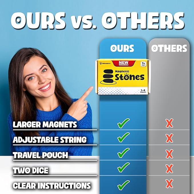 - NEW AND UPGRADED 2025 VERSION: Experience the enhanced magnetic stone board game with smoother, high-quality stones and stronger magnets. Features an adjustable string for customizable difficulty and dice for extra fun and challenge!