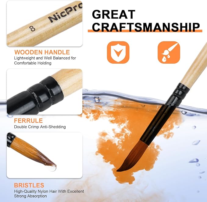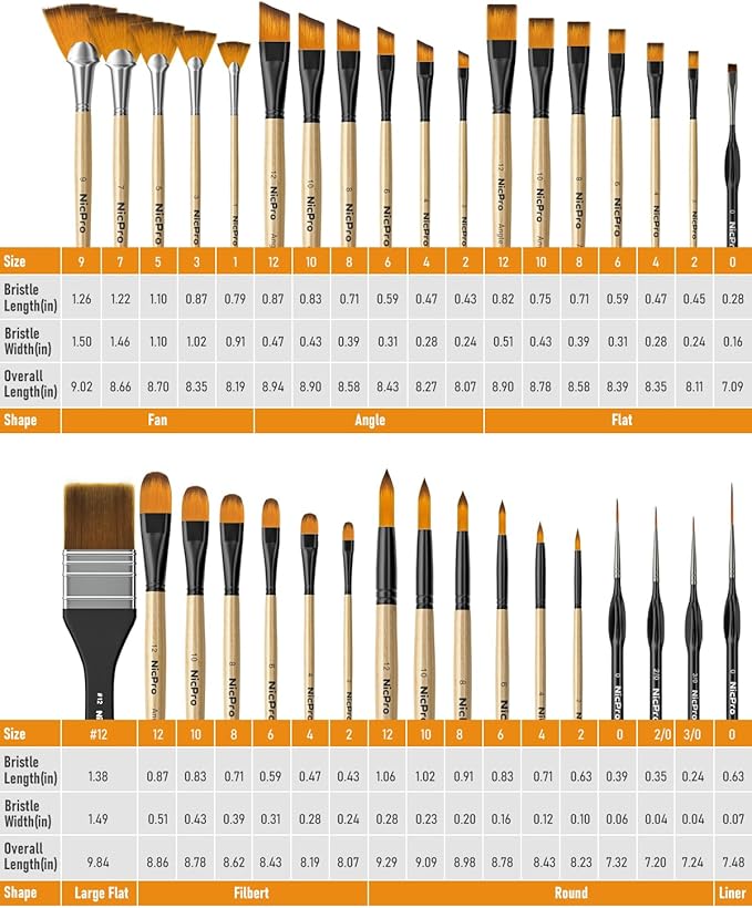 - All-around Brush Paint Set: Nicpro 35 different sizes of round, flat, angle, filbert, fan, large flat, detail brushes with easy-to-identity labels leave you in good hands for detailed paintings and large coat applications, creating a vibrant work of art. They are perfect for acrylic paints, watercolors, gouache, oil paints, etc. Ideal gifts for teenagers, friends, beginners, artists or anyone interested in painting