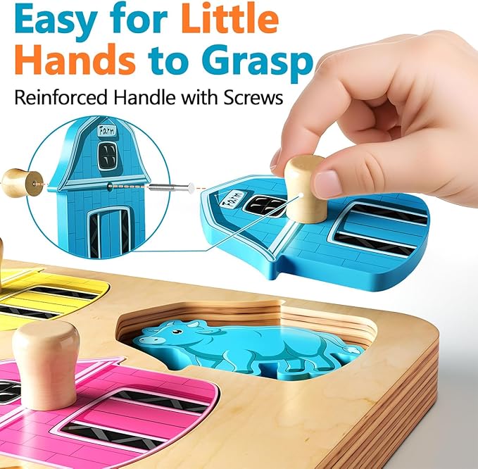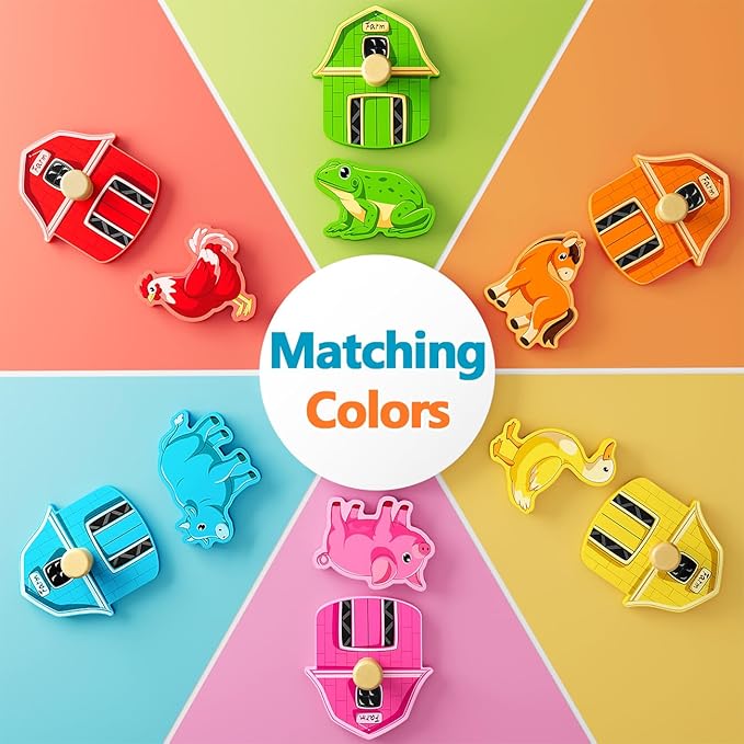 - Easy-to-Grasp Color Matching Puzzle: Each piece is designed with a farm animal and matches in color to its corresponding farm piece. Toddlers can enjoy matching the colors and learning about farm animals vividly. Featuring easy-to-grasp wooden knobs, this puzzle allows toddlers to grasp, lift, and manipulate the pieces with delight, all while enhancing their fine motor skills.