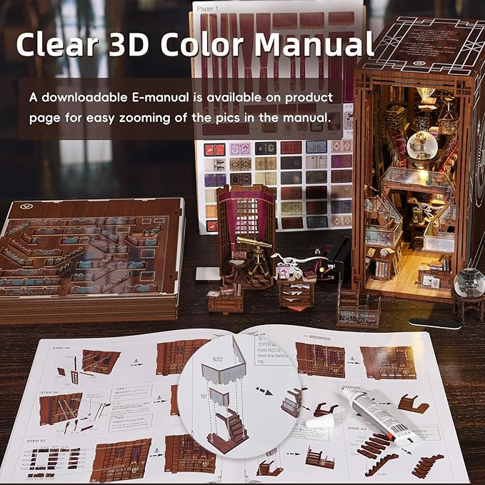 - [Bring Fun to Life] The diy book nook kit combines fun and relaxation. During the 6-10 hours of enjoyable assembly time, you can improve your dexterity and patience with this miniature dollhouse booknooks.Additionally, the downloadable E-manual can be zoomed to help identify parts orientation more clearly