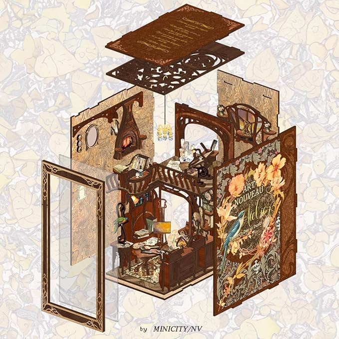 - 【MiniCity Book Nook】Painter's Day at Dusk, the theme concept design comes from the Art Nouveau Atelier with its rich history and unique aesthetic, which have always inspired artists and designers. This charming and intricate miniature scene captures the essence of Art Nouveau, allowing you to bring a touch of artistic charm to your home decor