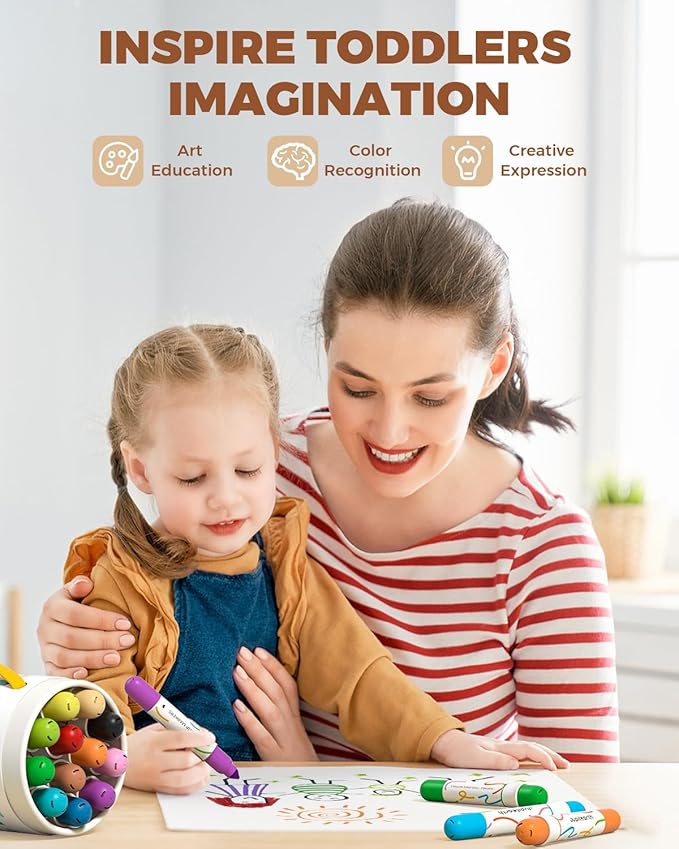 - SAFE FOR LITTLE HANDS: Crafted for little artists, our kids markers washable are designed with a fun, cute and chunky shape that's easy for tiny hands to hold. The food-grade ink & plastic barrel toddler coloring set ensures safe play, and the cap features air holes to minimize choking risks. Let your child color with comfort