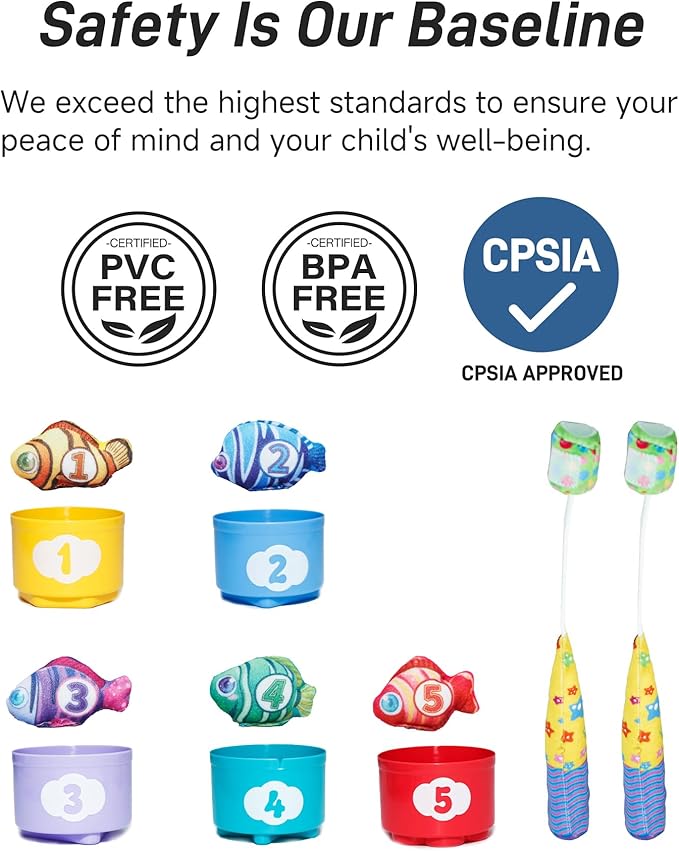- Encourages Fine Motor Skills & Hand-Eye Coordination: Toddlers will love “fishing” with the squeezable rods, which feature a self-stick pad to help “catch” the fish. Parents can join in too, creating a fun and educational bonding experience. Great for developing hand-eye coordination and finger strength!