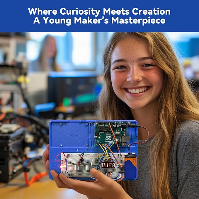- Comprehensive Arduino Learning: The kit includes an Original Arduino Uno R3, 34 lessons, step-by-step guidance, code examples, circuit diagrams, and an RAB Holder for easy setup and component organization. Designed for beginners aged 8 and up