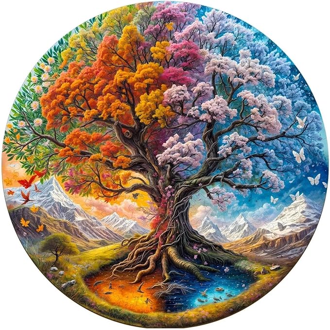 Wooden Puzzles Adults, Seasonal Tree of Life Wooden Puzzles 300 Pieces, Unique Animal Shaped Wood Challenging Jigsaw Puzzles for Adults, 13.4x13.4in