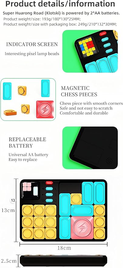 - ★★Product function/information description★★: Huarong Dao (Smart Klotski) is powered by 2*AA batteries, which is very convenient. We can provide English/French/German/Italian/Spanish instructions for this product. If necessary, please leave us a message. Product weight/size: 220g/16.8*11.5*2.5CM; Product weight/size with packaging box: 340g/190*12.5*3.3CM;