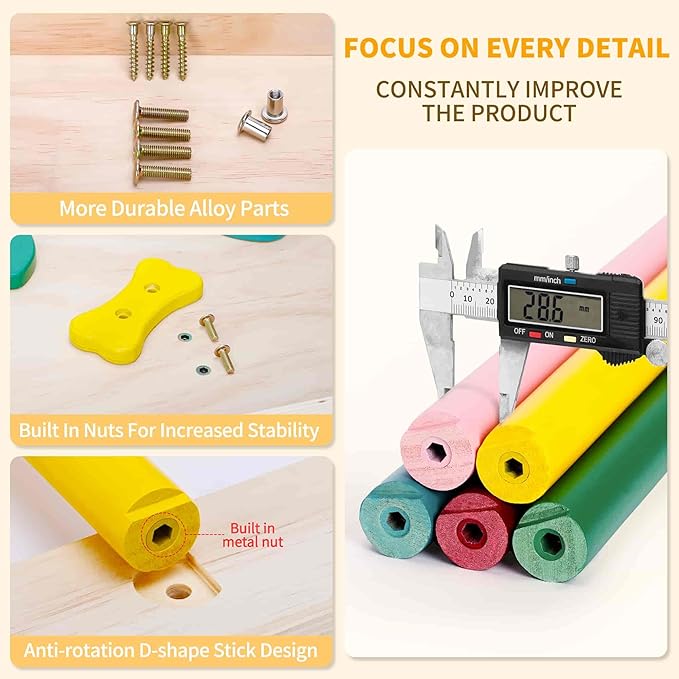 - Double Safety: The Pikler triangle has 2 handholds, and the arched ladder has 8, ensuring your child doesn't lose balance while pikler climbing triangle or sitting on the rocking chair. The climbing set is made from natural pine and poplar wood, providing a comfortable texture while being more durable (maximum load 200 pounds). Each round stick have internal nuts and an external D-shaped groove,ensuring that installation stability and preventing the child from falling due to stick rotation.